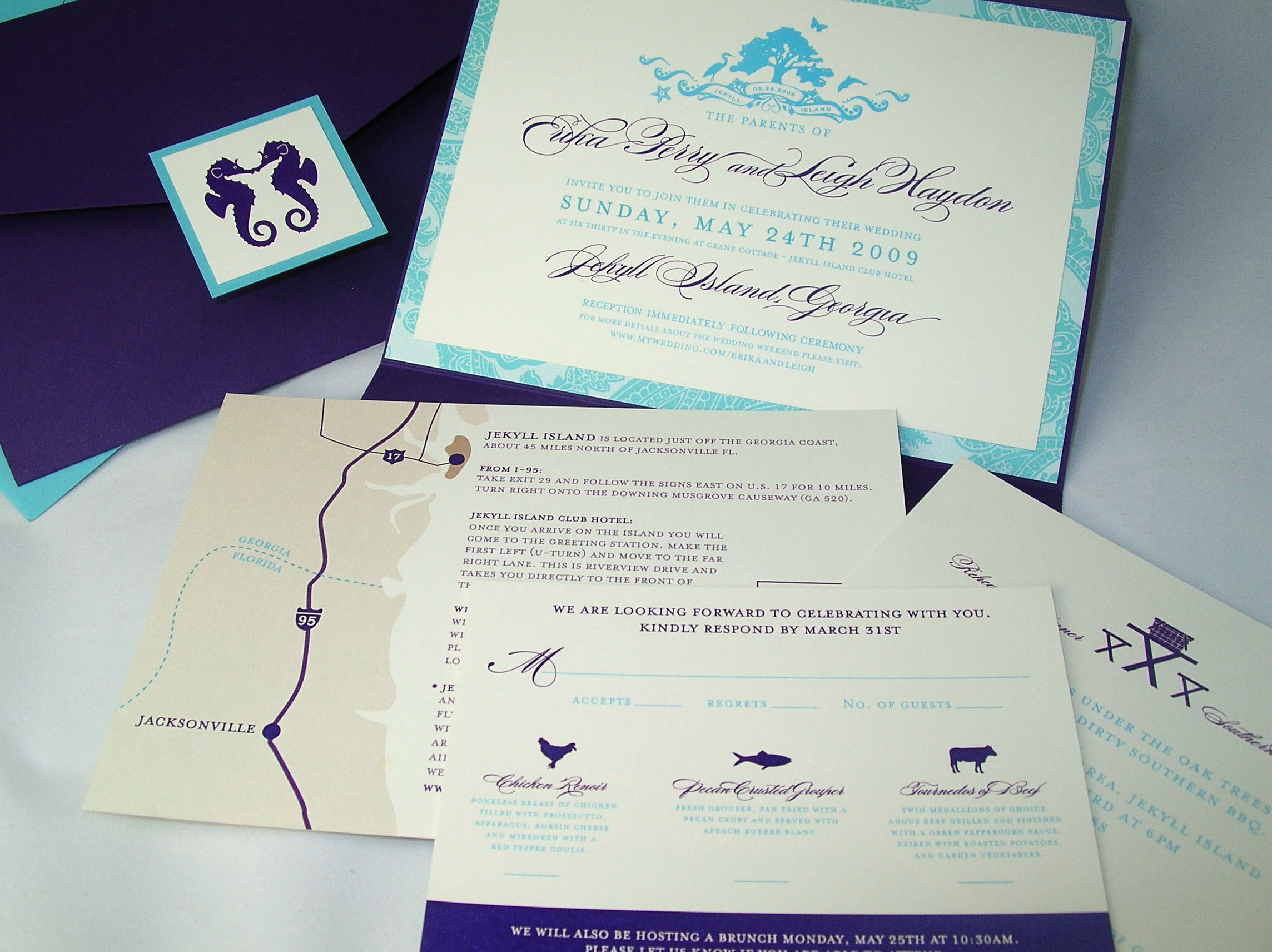Finally, she decided to create her own invitation, combining her design skills with elegant Envelopments® Pocketfolds and cardstock.  Erika designed all the pieces for her invitation and had everything commercially printed on our color digital press. Her attention to detail is evident on every piece of the ensemble.