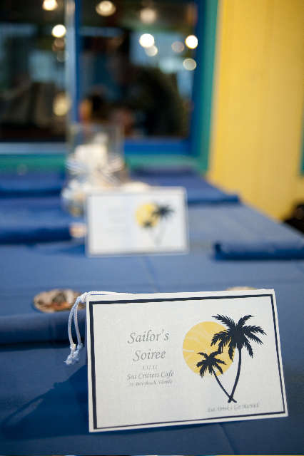The welcome bag has to the be the cutest bag I’ve seen! It has so many different elements that were pulled together to create a festive welcome for the guests! The simple use of a yellow backing on the “Welcome to St. Pete Beach” tag helps it to pop out, and the string tied to the stick poking out of the bag gives a sense of “handmade with love”. Let’s not downplay the 4.1.11 embroidered into the handle that definitely gives it that final finishing touch. The “welcome tags” were printed and die-cut by the bride on matching stock to coordinate with the invitations and save-the-dates.